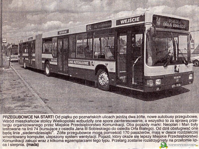 Skan z Głosu Wielkopolskiego. Testowy MAN na linii 74, równocześnie na linii 74 kursował, żółty Neoplan N4021td.